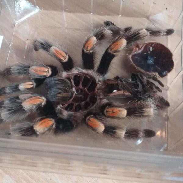 Het is de vervelling van een spin. Onze Mexicaanse roodknievogelspin ging op zijn rug liggen met de pootjes omhoog en kroop toen uit zijn velletje. Het resultaat is een spin die er weer picobello uitziet plus een exacte kopie dat niet meer is dan een leeg omhulsel. Op de tweede foto zie je rechtsboven het rugschild. Een knap staaltje van de natuur!